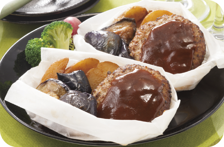 レンジで簡単におかずが出来上がります。紙包みハンバーグ(デミソース)